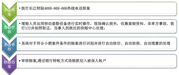 根据車(chē)辆保险案件的损失金额和类型,可(kě)分(fēn)為(wèi)小(xiǎo)额案件和非小(xiǎo)额案件。小(xiǎo)额案件是指案情简单且损失金额较小(xiǎo)(一般指事故总损失在5000元以内),事故只涉及到車(chē)辆和第三者财产(chǎn)损失的保险案件。对于小(xiǎo)额案件,長(cháng)江财险采取的是快速处理(lǐ)机制,让客户感受到長(cháng)江财险方便、快捷的車(chē)险理(lǐ)赔服務(wù)。 小(xiǎo)额案件快赔流程: 非小(xiǎo)额案件处理(lǐ)流程: